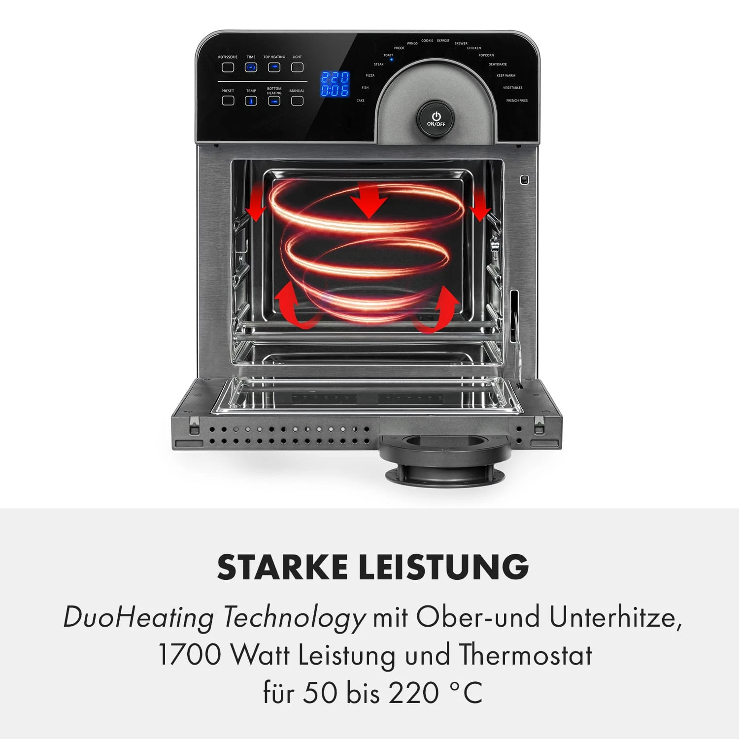Dank der zwei Heizelemente (Ober-und Unterhitze) kannst du jede erdenkliche Speise bis zur Perfektion frittieren, backen, grillen oder rösten. Auch die Bedienung ist ganz einfach, denn die AeroVital Cube Chef bietet 16 vorsteingestellte Programme, die du direkt über ein digitales Bedienfeld mit Touchscreen auswählen kannst. Individualisten können natürlich auch manuell Temperatur und Laufzeit einstellen. Ihre großzügige Kapazität von 14 Litern und das umfangreiche Zubehörset lassen keine Wünsche offen.