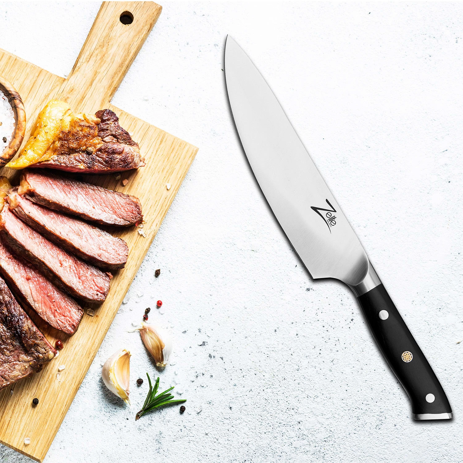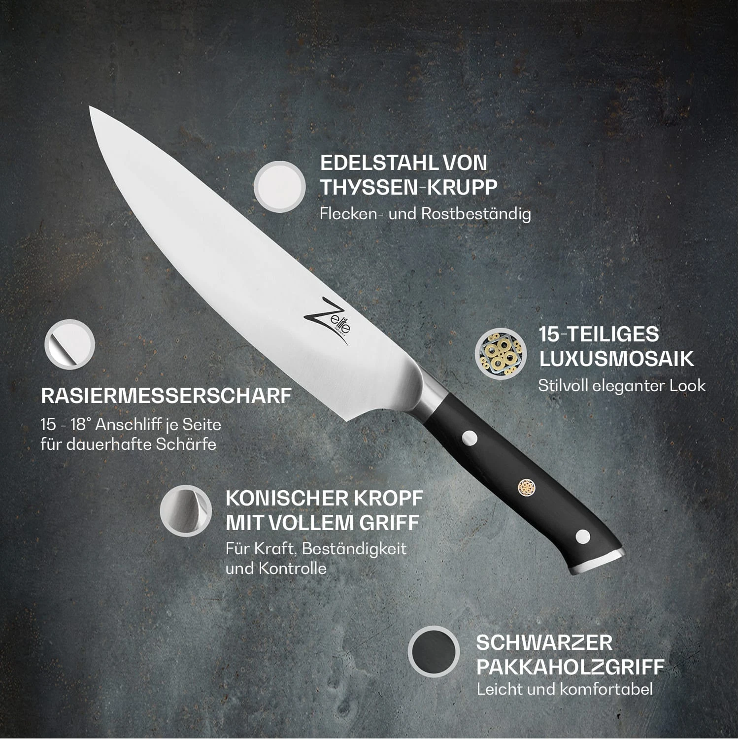Das 8″ Kochmesser ist aus deutschem Qualitäts-Edelstahl von Thyssenkrupp und schwarzem Pakkaholz gefertigt. Der ergonomische, dreifach vernietete Griff ist mit einer Mosaikniete versehen und liegt beim Schneiden gut und sicher in der Hand. Die 8″ Klinge des Küchenmessers ist nicht nur ultrascharf und gleitet durch Fleisch wie durch warme Butter, sie ist auch ideal zum Schneiden von anderen Lebensmitteln wie Fisch, Gemüse oder Obst geeignet. Zusätzlich ist eine Lederscheide zum Schutz der Klinge im Lieferumfang enthalten.