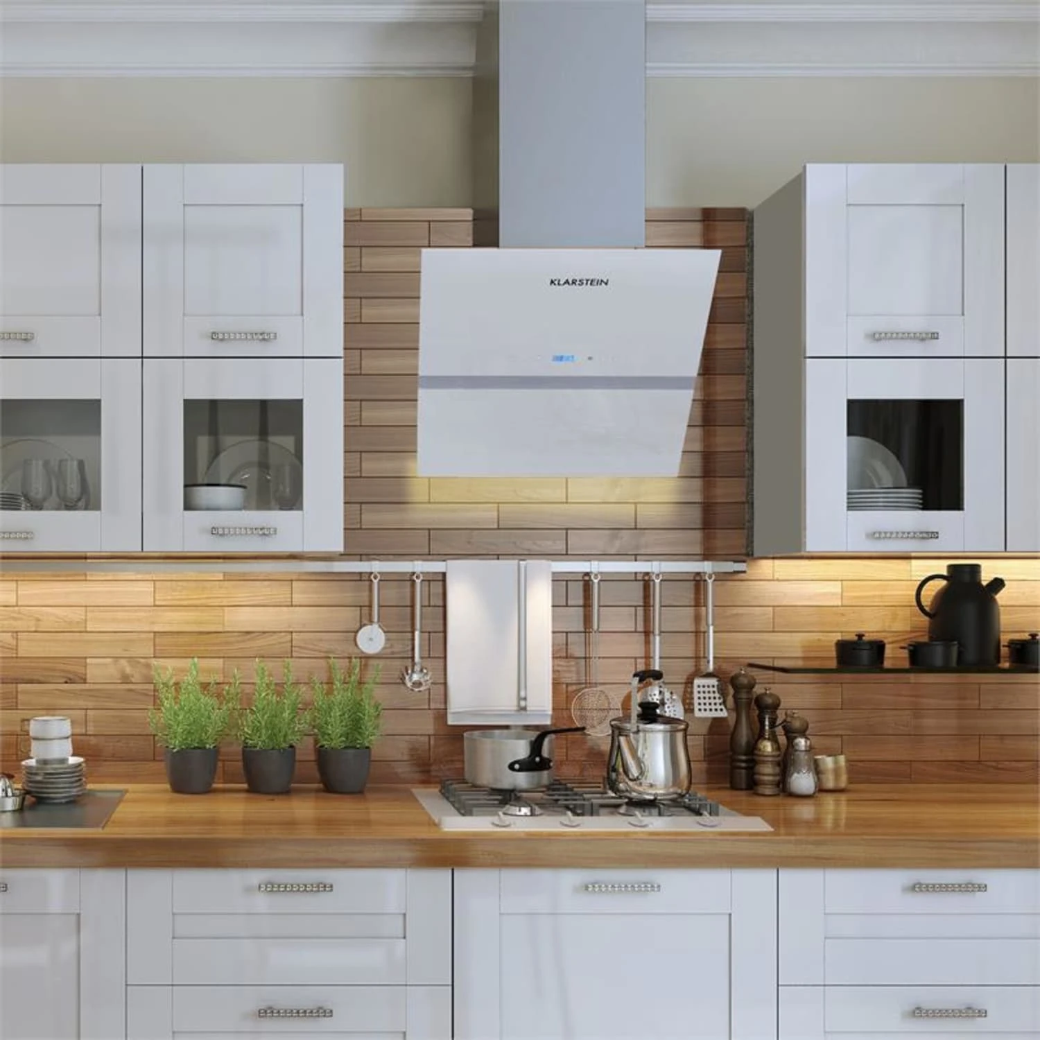Mit ihrer eleganten Front aus gehärtetem Spezialglas versprüht die Klarstein Aurea VII Dunstabzugshaube einen frischen Glanz vor allem in modern eingerichteten Küchen, versteht sich aber auch gut als luxuriöser Kontrapunkt in klassischen Umgebungen. Besondere Akzente setzt der gebürstete Edelstahl einer Zierleiste sowie der ausziehbaren Esse, in der sich unsichtbar der Abluftschlauch verbirgt.
