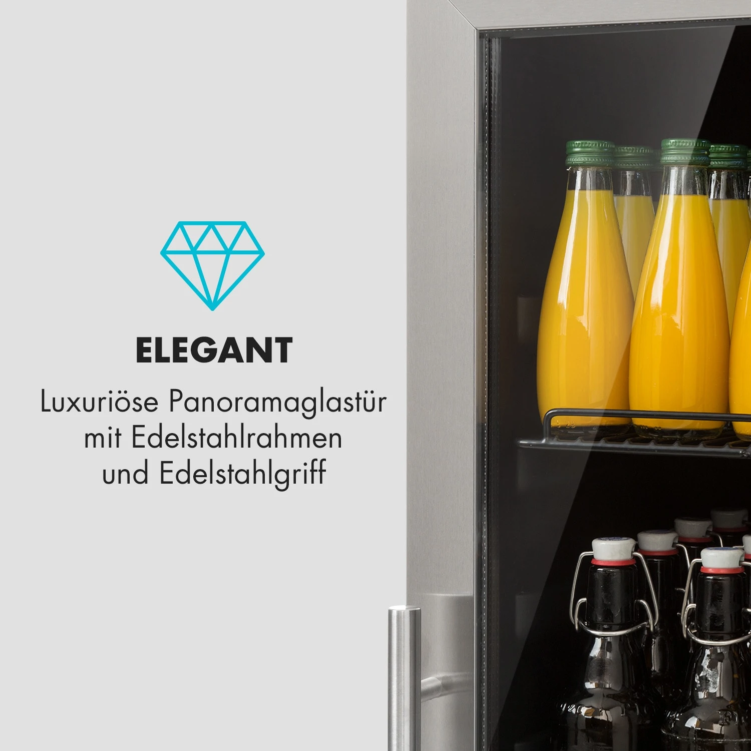 Fünf Metall-Gitterböden bieten viel Platz für Speisen und Getränke. Die doppelt isolierte Panoramaglastür hält die Kälte drinnen und die Wärme draußen. Die Front aus gebürstetem Edelstahl bildet einen guten Kontrast zur schwarzen Innenausstattung. Ein zusätzliches Highlight ist die LED-Innenbeleuchtung, die dem Beersafe 7XL den letzten Schliff verleiht. Die Kühltemperatur kann bequem über ein Bedienfeld mit Digitalanzeige eingestellt werden.