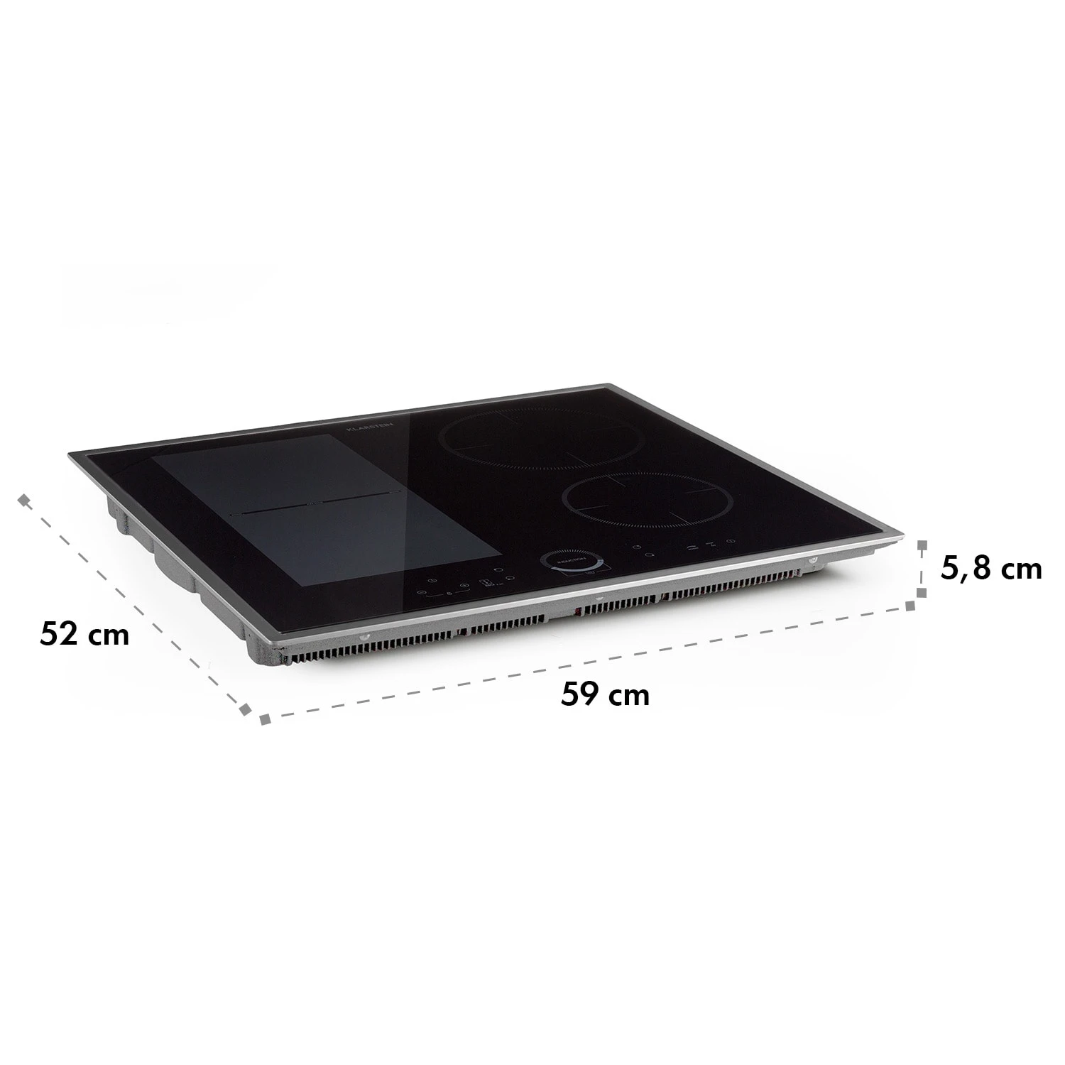 Vier Kochflächen für den Genuss bietet das Klarstein Delicatessa 60 Hybrid Prime Einbaukochfeld bei einer Gesamtleistung von bis zu 7000 Watt, die sich mit 2 x 2000 Watt und 2 x 1500 Watt auf die einzelnen Kochflächen verteilen und die Inhalte von Töpfen und Pfannen in Spitzenzeiten zum Kochen bringen. Dabei vereinen sich per VarioHeating die beiden linken Kochzonen zu einer Flexzone: Mit maximaler Flexibilität passt sie sich dank Topferkennung an die Größe der darauf gesetzten Töpfe, Pfannen oder Kasserolen an und erhitzt so auch großes Kochgeschirr, das nicht auf ein einzelnes Kochfeld passt. Damit verbraucht die Delicatessa 60 Hybrid Prime zum einen wirklich nur die Energie, die für den Topf passend ist und ermöglicht zum anderen die Nutzung fast jeder Topf- oder Pfannengröße. Alle Felder lassen sich separat in ihrer Leistung regeln und verfügen über eine ThermoBoost-Funktion, mit der die Leistung zum schnellen Erhitzen nochmals auf bis zu 2800 Watt gesteigert wird. Bedient wird das Klarstein Delicatessa 60 Hybrid Prime Glaskeramik-Kochfeld unkompliziert mit einem integrierten SenseControl Touch-Panel mit Touch-to-slide-Regler zur Leistungskontrolle und Digitaldisplay. So durchbrechen weder Knöpfe noch Regler die Oberfläche der Küchenzeile. Neben der Leistung kann für jedes Kochfeld ein bis zu 99-minütiger Timer programmiert werden, der entweder nach Ablauf der eingestellten Zeit die Kochplatte abschaltet oder ein akustisches Signal ertönen lässt.