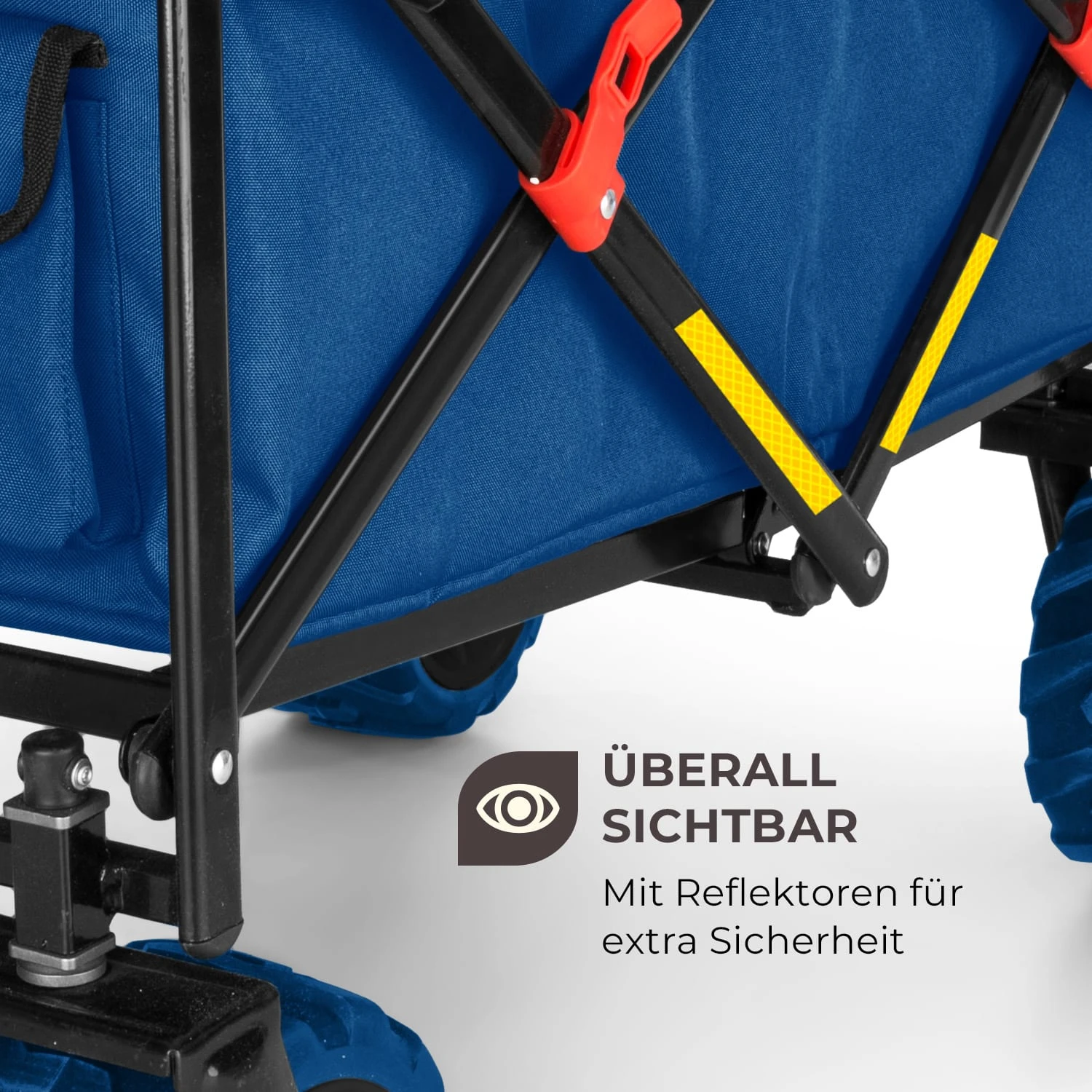 Mithilfe der ausziehbaren Teleskopstange vorne und der klappbaren Schubstange hinten lässt sich der Handwagen wunderbar einfach ziehen oder schieben. Die Räder sind frei beweglich und mit Kugellagern ausgestattet, was geschmeidiges und leichtes Fahren garantiert. Für extra Sicherheit, was vor allem beim Transport von Kindern wichtig ist, sorgen die beiden Sicherheitsgurte im Innern und die Reflektoren außen am Wagen. Dank des gepolsterten Bodens ist beim Transport jederzeit ein hoher Sitzkomfort gegeben, der allen Kindern gefallen wird.