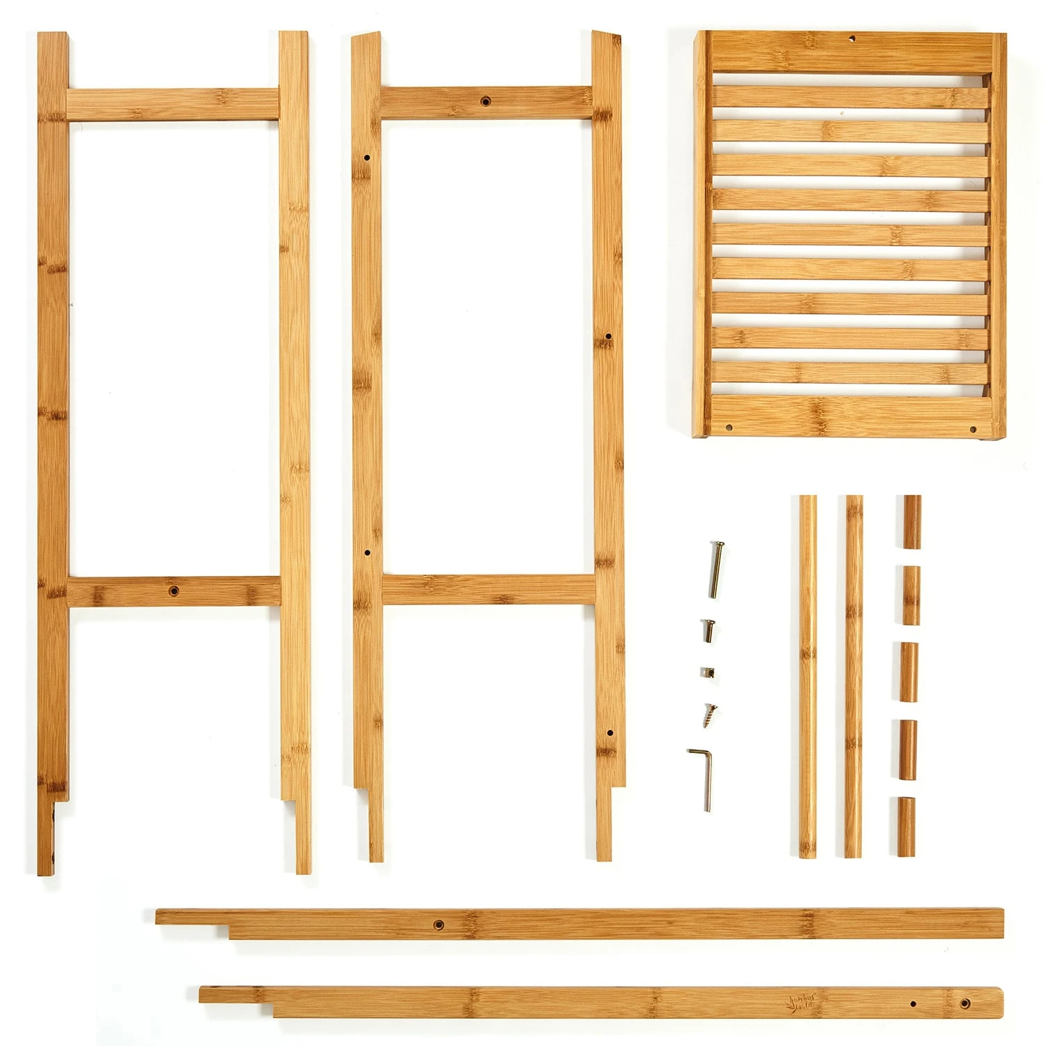 Der solide Kleiderständer ist aus leichtem, robustem Bambus gefertigt. Da er freistehend ist, kannst du ihn genau dort aufstellen, wo du möchtest. Die feine, für Bambus typische Maserung sorgt in Kombination mit dem warmen Holzton für Wohlfühl-Atmosphäre. 5 Garderobenhaken, 2 Kleiderstangen und eine Ablagefläche für Hüte, Mützen oder andere modische Accessoires halten viel Platz für deine Jacken, Taschen und Mäntel bereit. Die versenkten Schraubenköpfe stellen sicher, dass deine Kleidungsstücke nirgendwo hängen bleiben. Der Aufbau ist dank bebilderter Anleitung und Montagematerial ein Kinderspiel.