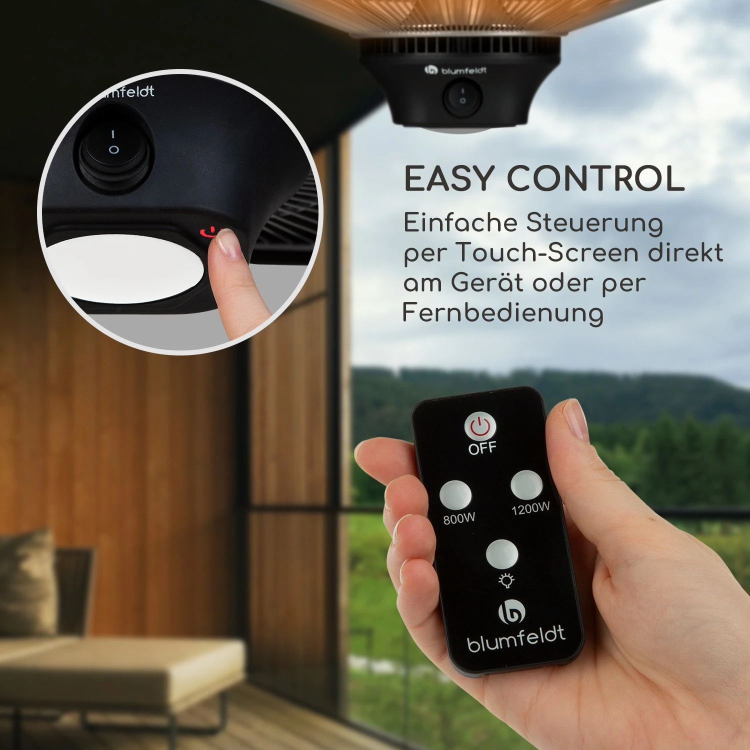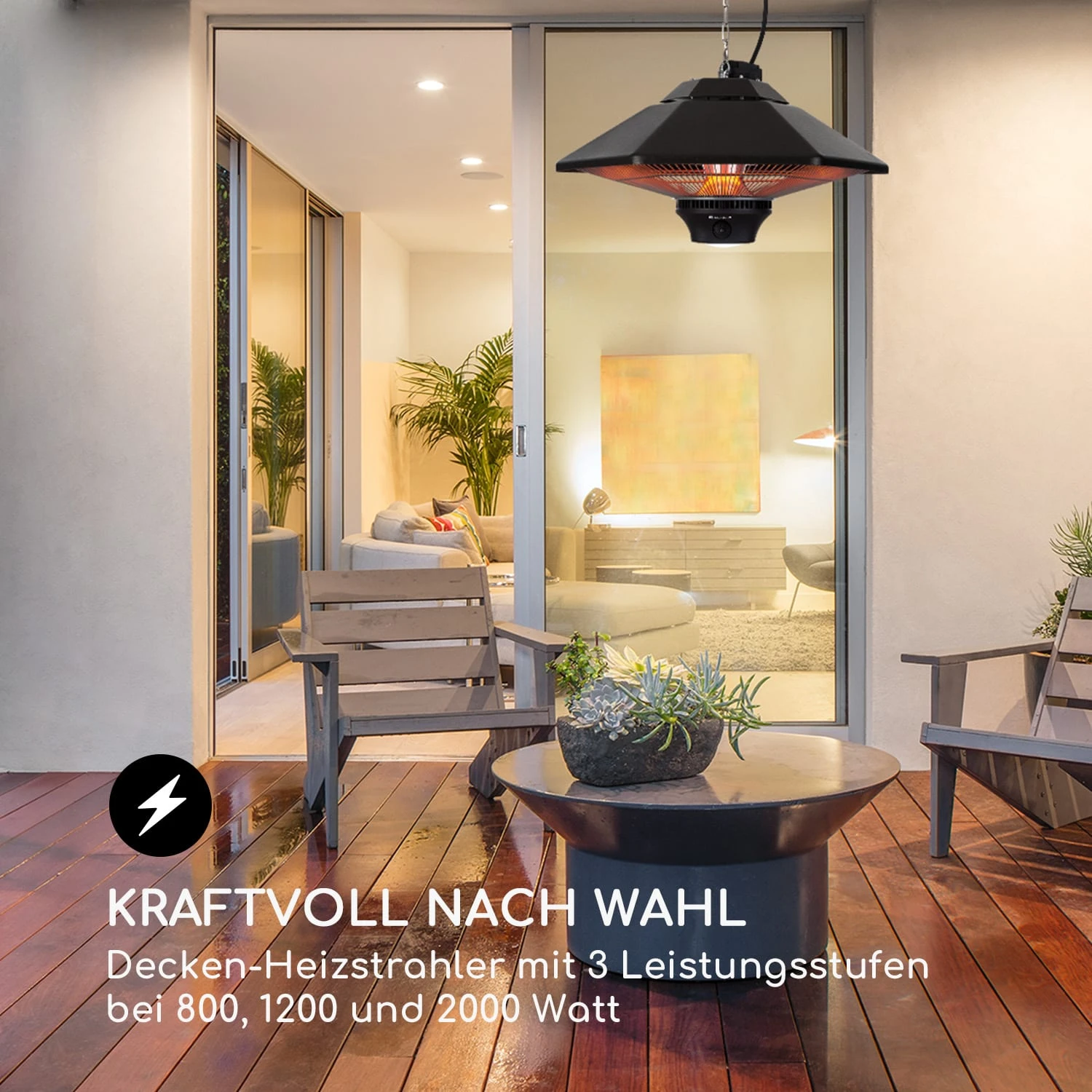 Der blumfeldt Heat Hexa Heizstrahler wird unkompliziert mit einer 50 cm langen Ketten an der Decke aufgehängt und versorgt so dich und deine Gäste schnell und effizient mit bis zu 2000 Watt Heizleistung. Das IR ComfortHeat-System liefert nicht nur sehr schnell Wärme, sondern gibt sie dank hocheffizientem Aluminium-Reflektor und langwelliger Infrarot-Strahlung gezielt an in der Nähe befindliche Personen und Gegenstände ab, ohne die Luft aufzuheizen. Genieße wohlige Wärme ab der ersten Sekunde! Mit einer sanften Berührung des intergrierten Touch-Panels kannst du in Sekundenschnelle zwischen den drei Wärmestufen – 800, 1200 oder 2000 Watt – wählen und so ganz leicht auf die Bedürfnisse deiner Gäste reagieren. Oder steuere die Wärmelampe ganz bequem per Fernbedienung. Plane unbesorgt Abendessen auf dem Balkon oder der Terrasse, ohne dir dabei um die Temperaturen Gedanken zu machen, denn sofort nach dem Anschalten erzeugen die Halogen-Heizelemente ohne lange Aufwärmphase direkt eine angenehme, heimelige und sichere Wärme. Aus Stahl gefertigt, ist der sechseckige blumfeldt Heat Hexa Infrarot-Heizstrahler nicht nur robust, sondern auch ein edler Anblick. Seine integrierte LED-Lampe kann separat eingeschaltet werden und sorgt für Helligkeit in dunklen Stunden. Für den sicheren Gebrauch im Freien ist das Gehäuse nach IP34 spritzwassergeschützt und kann auch an feuchten Abenden problemlos verwendet werden.
