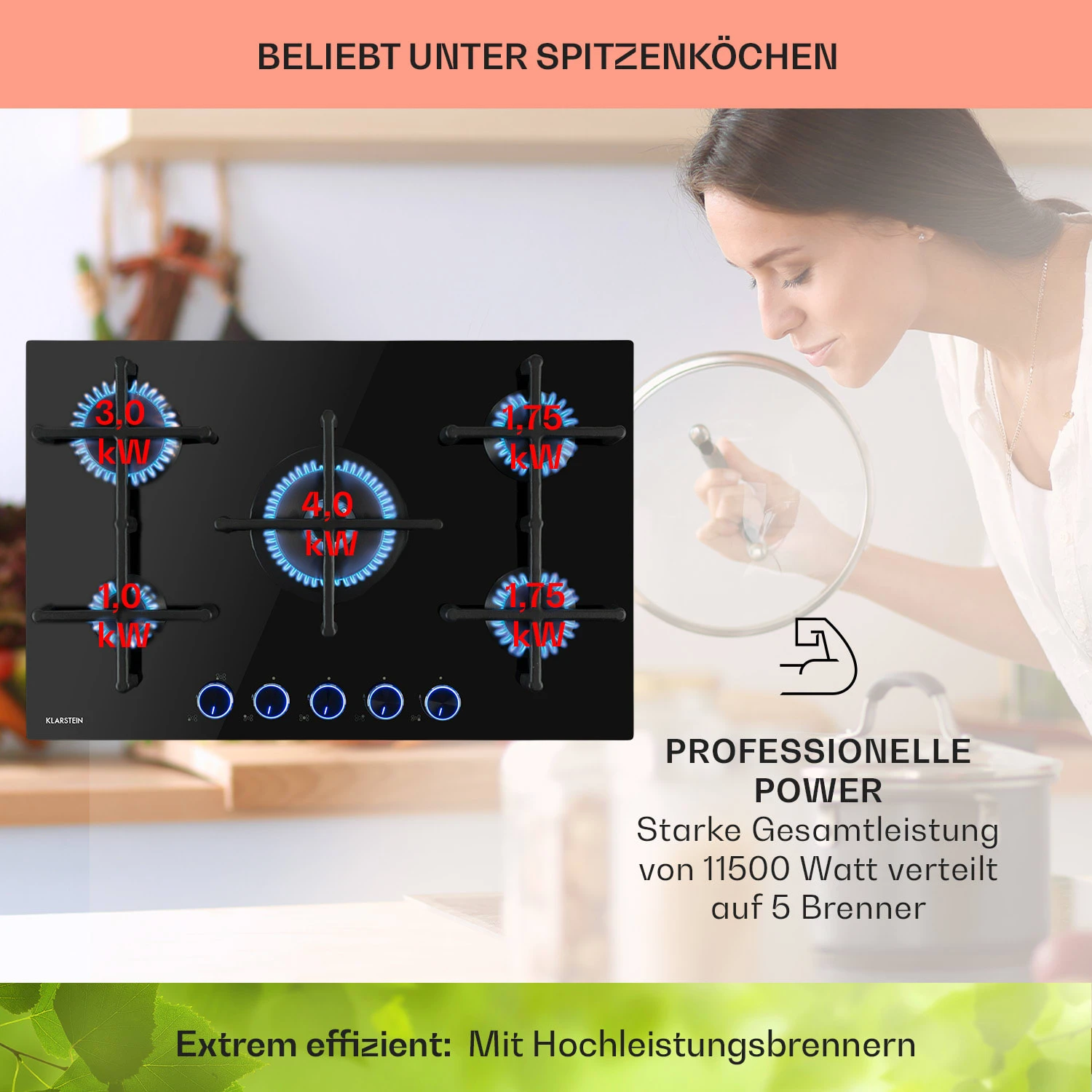 Auf dem platzsparenden Klarstein Illuminosa 5 Kochfeld befinden sich fünf hochwertige Sabaf-Brenner, die mit einer Leistung von 4 kW, 3kW, 2 x 1,75 kW und 1,0 kW ordentlich einheizen. Alle Brenner verteilen die Hitze gleichmäßig in der Mitte und an den Rändern der Töpfe oder Pfannen, alles wird perfekt und bestmöglich gegart. Die Kreuze aus massivem Gusseisen sind für beinahe alle Arten von Kochgeschirr geeignet und sitzt passgenau und kippsicher über den Flammen. Dafür sorgt die integrierte Magnethalterung, sodass keine Mulde oder Befestigungslöcher die Oberfläche des Herds mehr stören. Die Bedienung ist dank der selbsterklärenden Symbole an den großen Drehknöpfen absolut intuitiv. Für optimale Sichtbarkeit der Einstellungen sorgen integrierte LEDs, die die Regler zum Leuchten bringen. In der leichten Regulierbarkeit liegt auch der große Vorteil von Gasherden: Die Hitzezufuhr kann während des Kochvorgangs immer wieder direkt angepasst werden. Änderungen an der Flammengröße wirken sich unmittelbar in Temperaturänderungen an Topf oder Pfanne aus. Natürlich haben wir auch auf die Sicherheit am Herd geachtet: Zusätzliches Feuer zum Entzünden ist nicht nötig. Die Gasflamme wird einfach per elektrischer Zündung entfacht. Der Flammenausfall-Schutz schließt die Gaszufuhr zum Brenner, sollte die Flamme aus irgendeinem Grund einmal ausfallen.
