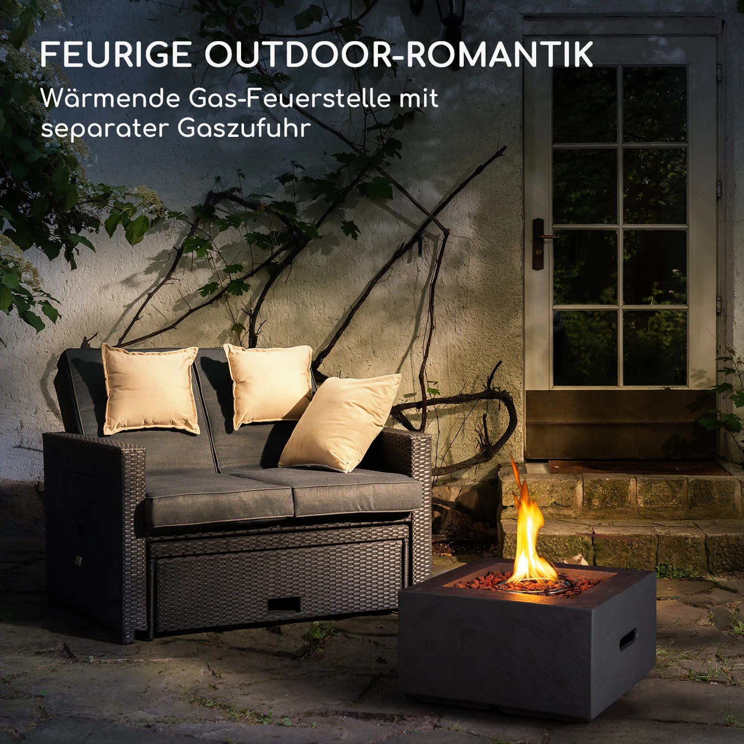 Leistungsstarke Gas-Feuerstelle für Romantik und natürliche Wärme in Outdoor-Oasen: Die blumfeldt Isaris Gas-Feuerstelle verbindet rustikale Schönheit mit komfortabler Funktionalität.