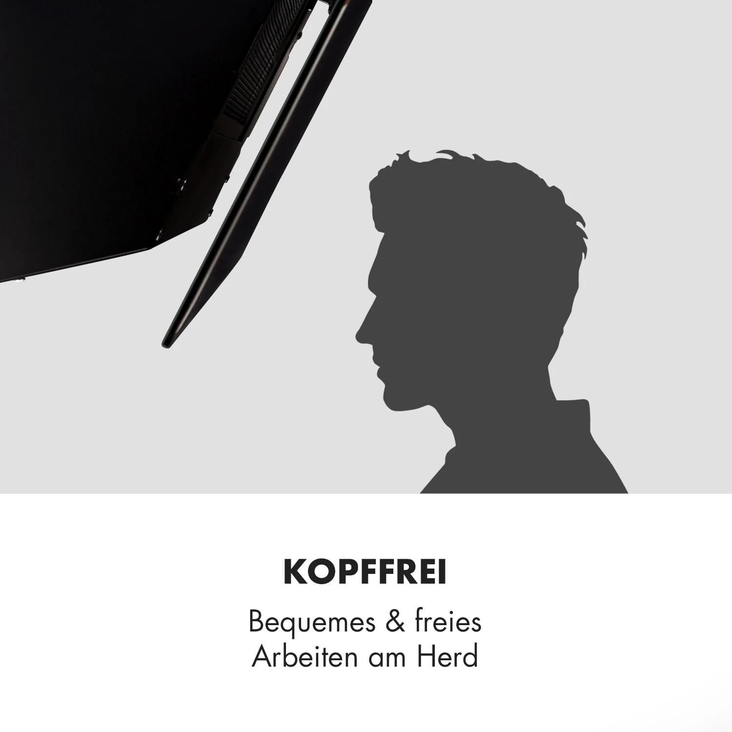 Neben den starken Leistungsdaten überzeugt die Klarstein Laurel 60 Wandabzugshaube als luxuriöser Teil der Kücheneinrichtung: Die schwarze Front mit aufklappbarem Panel aus glänzendem Sicherheitsglas verleiht ihr ein modernes Aussehen, dass durch eine 2-teilige, schwarze Kaminverkleidung ergänzt wird. Leistungsstarker, gläserner Luxus für die Küche.
