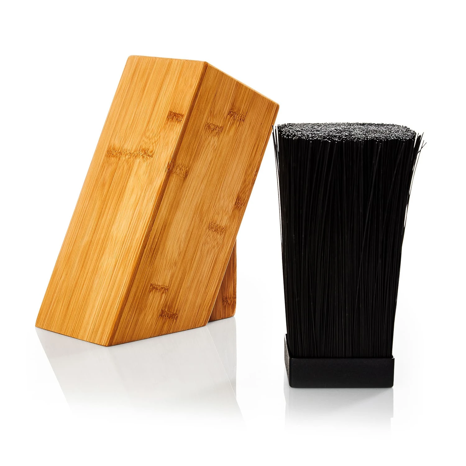 Sicher, praktisch, nachhaltig. Im Klarstein Messerblock sind deine Messer und Küchenutensilien bestens aufbewahrt. Der innovative Einsatz aus PET-Borsten erlaubt das Aufbewahren von 5 bis 10 Messern, Scheren, Wetzstählen und ähnlichem bis 20 cm Länge. Dabei kannst du die Messer ganz nach Belieben in den schrägen Block stecken. Der Einsatz ist herausnehmbar und kann ganz einfach in der Spülmaschine gereinigt werden. Ästhetisch ansprechend und nachhaltig präsentiert sich der Block in einer Hülle aus stabilem Bambus.