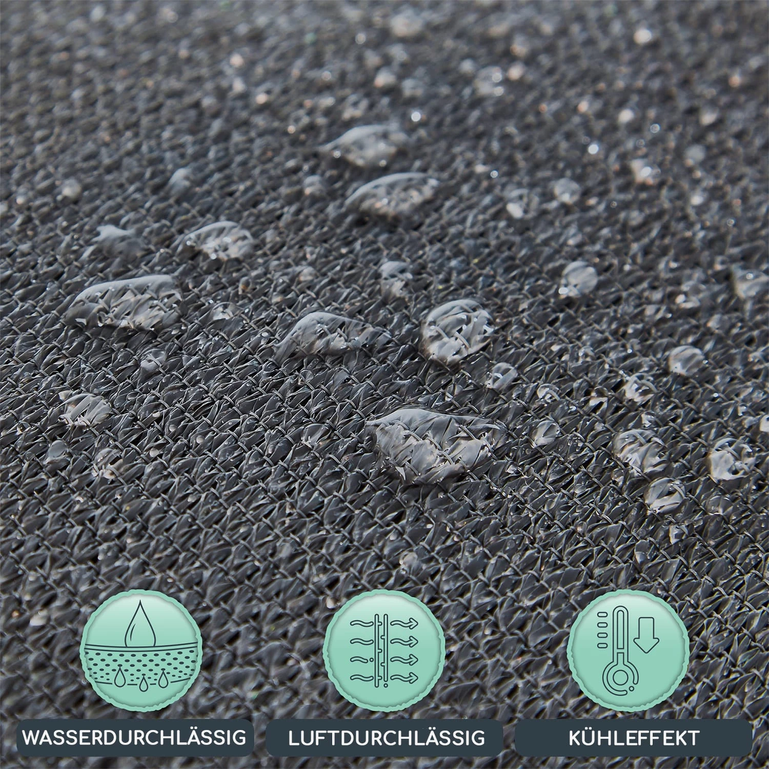Dank der rostfreien Ringe aus Edelstahl ist die Befestigung sehr unkompliziert. Ziehe einfach die Seile durch die Befestigungsringe, welche du in der Umgebung beliebig anbindest. Für eine dauerhafte Anbringung empfehlen wir dir, anstelle der Seile, Spann- oder Karabinerhaken zu verwenden. Dank des reißfesten und strapazierfähigen Polyester-Materials kannst du das Sonnensegel sehr straff und glatt aufspannen. Zudem ist das Material sehr luftdurchlässig, was dafür sorgt, dass sich unter dem Dach keine Hitze staut. Das Segel hält den Regen ab und ist zudem sehr belastbar, durch festes Material, hochwertige Verarbeitung und doppelte Nähte.