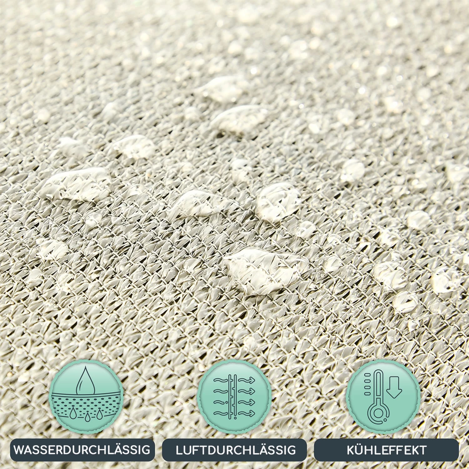 Dank der rostfreien Ringe aus Edelstahl ist die Befestigung sehr unkompliziert. Ziehe einfach die Seile durch die Befestigungsringe, welche du in der Umgebung beliebig anbindest. Für eine dauerhafte Anbringung empfehlen wir dir, anstelle der Seile, Spann- oder Karabinerhaken zu verwenden. Dank des reißfesten und strapazierfähigen Polyester-Materials kannst du das Sonnensegel sehr straff und glatt aufspannen. Zudem ist das Material sehr luftdurchlässig, was dafür sorgt, dass sich unter dem Dach keine Hitze staut. Das Segel hält den Regen ab und ist zudem sehr belastbar, durch festes Material, hochwertige Verarbeitung und doppelte Nähte.