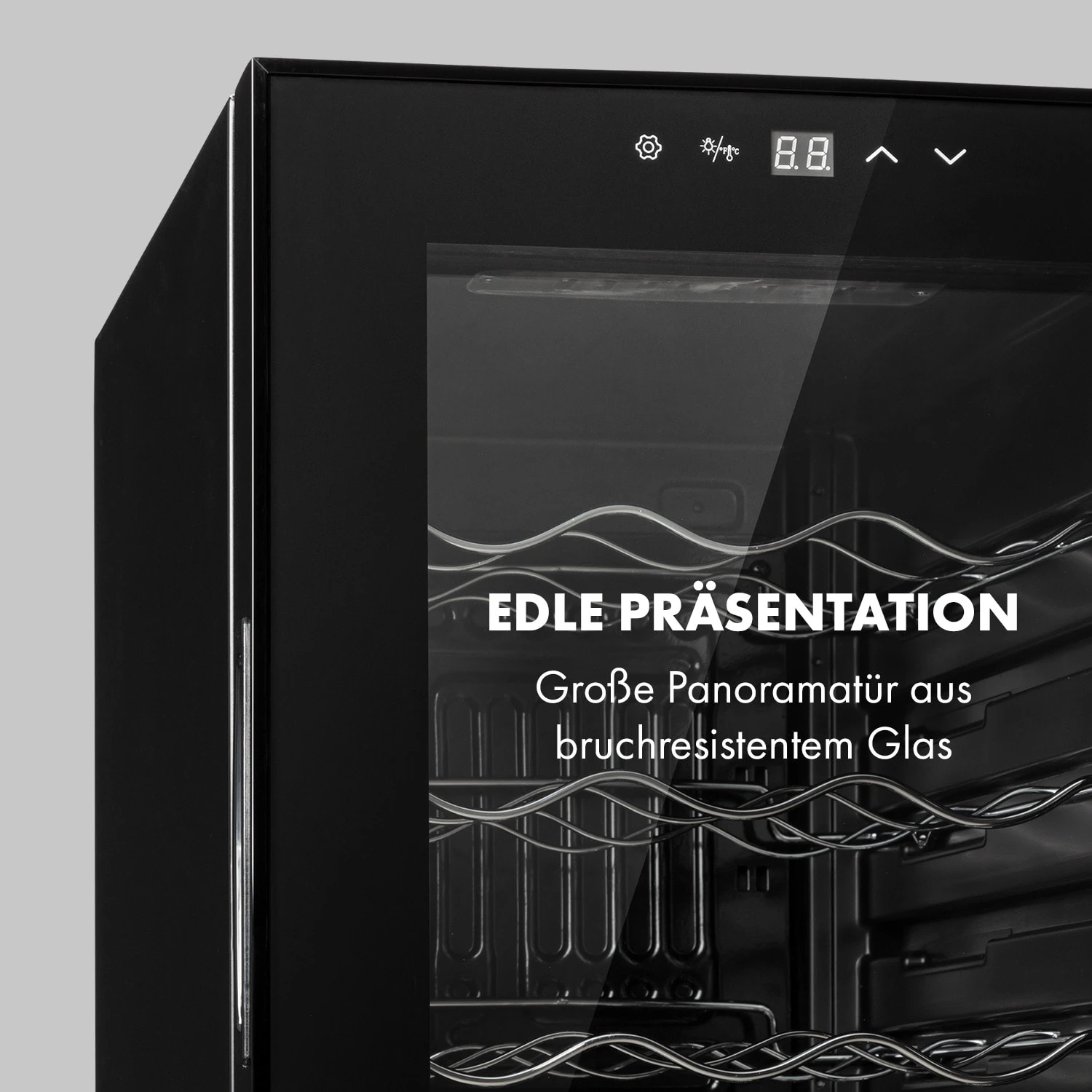Aus Liebe zum Wein: Der Klarstein Shiraz 18 Slim Uno Weinkühlschrank sorgt für besten Weingenuss, indem er Weinflaschen die richtige Trinktemperatur verschafft. Dabei glänzt er mit seinem Slim-Design und schmiegt sich auch in kleine Lücken wundervoll ein. Bis zu 18 Flaschen Wein kannst du mit ihm optimal lagern und auf eine Trinktemperatur zwischen 5 und 18 °C kühlen. Die Fronttür aus Sicherheitsglas ermöglicht dir dabei eine wundervolle Präsentation der edlen Flaschen.