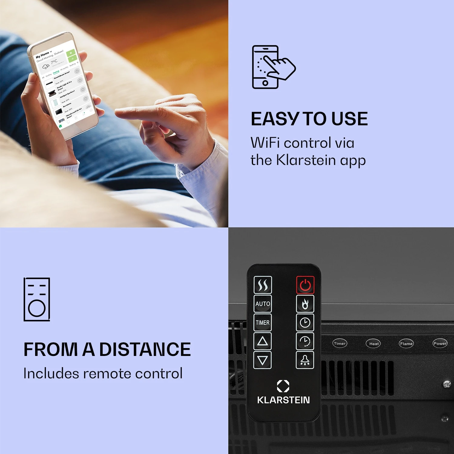 Der elegante Klarstein Studio Light & Fire 2 Smart Elektrokamin mit WiFi-Steuerung via Klarstein App zaubert realistische Flammenillusionen in jedes Zimmer. Der zuschaltbare Heizlüfter mit wahlweise 1000 oder 2000 Watt Leistung sorgt dabei jederzeit für angenehme Wärme. Mit Hilfe des praktischen Timers lassen sich sowohl Licht- als auch Heizfunktion bis zu 9 Stunden im Voraus ein- und ausschalten. Die einfache Bedienung des Elektrokamins erfolgt direkt am Kamin sowie komfortabel per App oder Fernbedienung. Somit kannst du alle Einstellungen auch bequem von der Couch oder unterwegs vornehmen.
