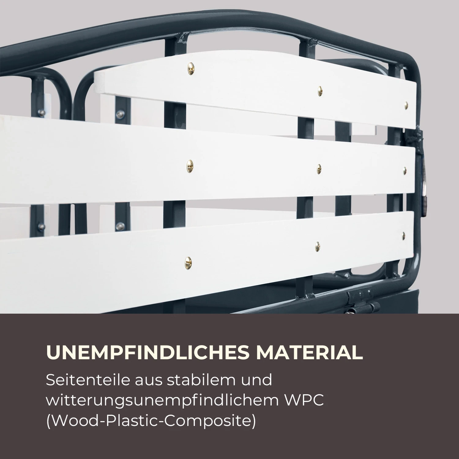 - Material der Seitenteile: Wood-Plastic-Composite (WPC, Materialmix aus 60 % Holz und 40 % Kunststoff)