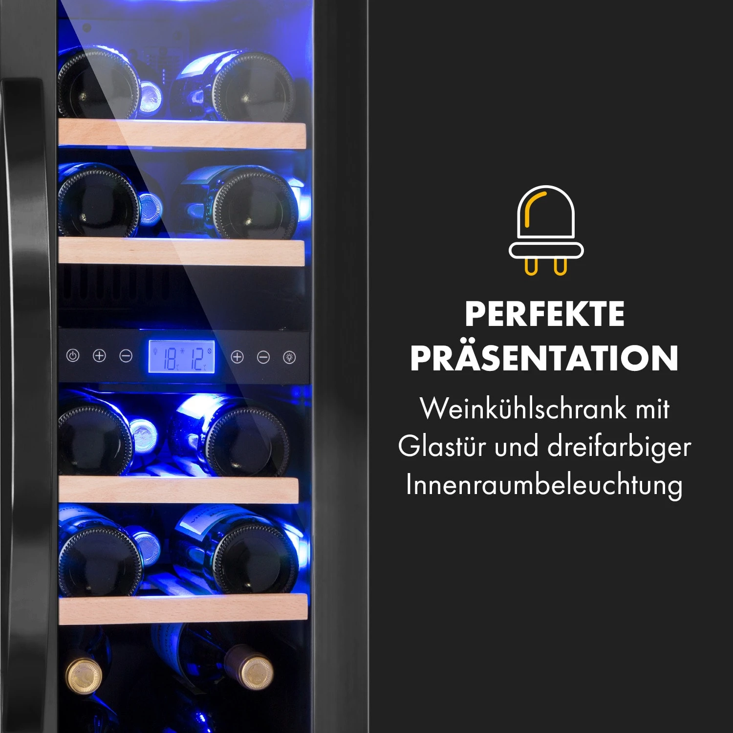 Edles Design und farbige Präsentation: Der Klarstein Vinovilla 17 Built-In Duo Doppelzonen-Weinkühlschrank passt dank Slim-Design in nahezu jede Lücke! Seine zwei Zonen kannst du separat temperieren, was dir eine zeitgleiche Kühlung und Lagerung von Rot- und Weißweinen ermöglicht. Aber auch Champagner, Schaumweine, Sekt oder andere delikate Tropfen lagern im Weintemperierer langfristig optimal. Neben besten Lager- und Kühlungsverhältnissen bietet er deiner Weinsammlung eine extravagante Bühne: Hinter Glas präsentieren sich die Flaschen wunderbar – rot, blau oder weiß beleuchtet.